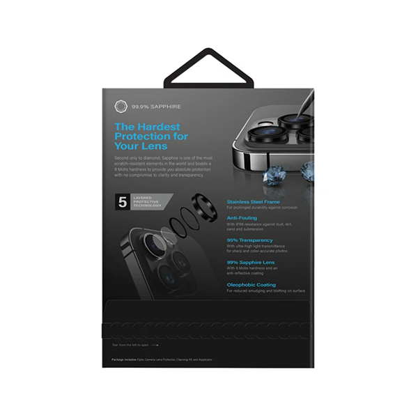 Защитное стекло Uniq OPTIX Sapphire надежно защитит камеру Apple iPhone от царапин и повреждений и поможет вам получить кристально чистое изображение на видео и фотоснимках. Изготовлено из сапфира твердостью 9M (по шкале Мооса) с антибликовым покрытием и обрамлением из нержавеющей стали. Сапфир, уступающий только алмазу, является одним из самых устойчивых к царапинам элементов в мире и может похвастаться невероятным уровнем прочности. Стекло супер прозрачное, не мутнеет, устойчиво к износу. Легко устанавливается, идеально повторяет контуры камеры. В комплекте 3 защитные линзы и аксессуары для легкой установки.