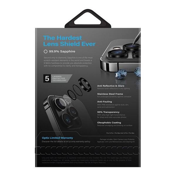 Защитное стекло Uniq OPTIX Prime Camera Lens для iPhone 16 Pro/16 Pro Max Sapphire Stainless steel Black (IP6.3P-6.9P(2024)-SSFSLENSBLK) надежно защитит камеру Apple iPhone от царапин и повреждений и поможет вам получить кристально чистое изображение на видео и фотоснимках. Изготовлено из сапфира твердостью 9M (по шкале Мооса) с антибликовым покрытием и обрамлением из нержавеющей стали. Сапфир, уступающий только алмазу, является одним из самых устойчивых к царапинам элементов в мире и может похвастаться невероятным уровнем прочности. Стекло супер прозрачное, не мутнеет, устойчиво к износу. Легко устанавливается, идеально повторяет контуры камеры. В комплекте 3 защитные линзы и аксессуары для легкой установки.